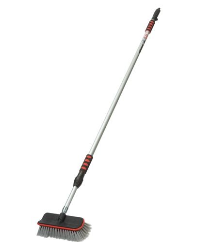 A 2 Stage Handle Extends to 3.0m that comes with Jet Grip Soap Dispenser. Plastic stock brush head with synthetic bristle and bi level trim. Bristles are medium and in high density on the head. Great for washing around the home. Not recommend by the supplier for intensive commercial washing operations.