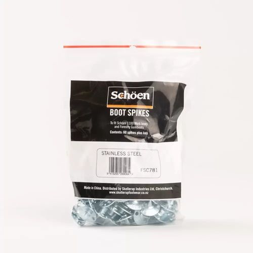 Stainless steel spikes to fit Schoen Forestry Gumboots. 60 per bag, includes key for easy removal and replacement.