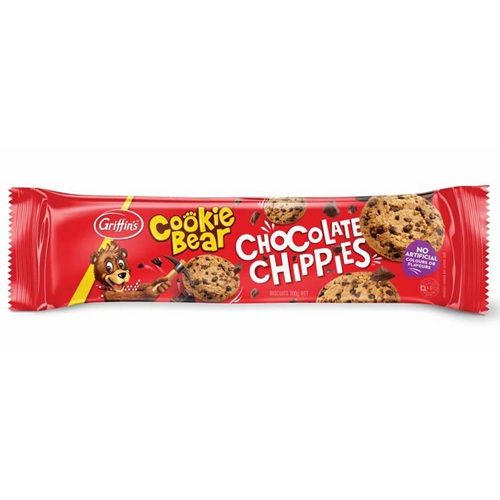 Chocka blocka chocka chippies!;a round cookie with dark choc chips.