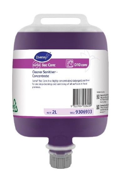 THIS IS A DANGEROUS GOODS PRODUCT, Shipping and Costs may vary. Suma® Bac Conc D10 conc is a highly concentrated detergent sanitiser for cleaning and sanitising of all surfaces in food premises. Features: Suma® Bac Conc D10 conc is a combination of a Quaternary Ammonium Compound, a sequestrant and a buffer system making this product very effective against a wide range of micro-organisms, in all water conditions. The formulation also contains surfactants to provide excellent cleaning power. Suma® Bac Conc D10 conc dose is controlled through the Diversey Divermite dispenser making the product very economical in use. Benefits: Reduces waste, needs less storage capacity and gives excellent economy in use due to highly concentrated formulation. Can be used to clean and to sanitise in one step, when used as directed. Cuts through grease and dried-on food soiling. Effective against a wide spectrum of micro-organisms, helping to improve hygiene security. Effective in all water conditions. Application areas Hospitality, Lodging, Healthcare, Food Service