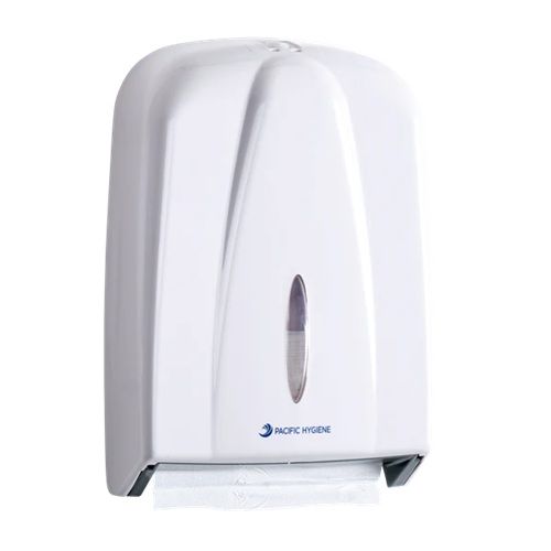 The Pacific Hygiene Trim Hand Towel Dispenser in white is designed to accommodate Pacific Hygiene's Trim hand towels. With its slim and lower profile design, the Trim Towel Dispenser is suitable for smaller-sized kitchens, bathrooms or limited workspaces. It features a sight window for easy refilling and provides security with a key lock or easy access with a push button.