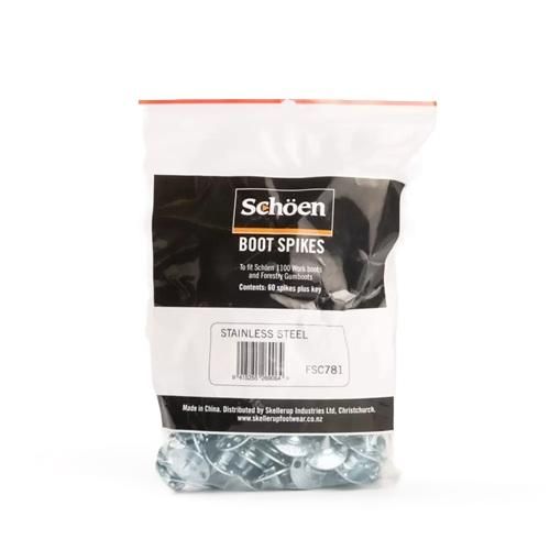 Stainless steel spikes to fit Schoen Forestry Gumboots. 60 per bag, includes key for easy removal and replacement.