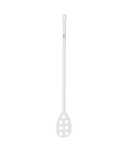Small blade with holes and a long handle. The holes allow the ingredients to pass through the stirrer blade and ease stirring.